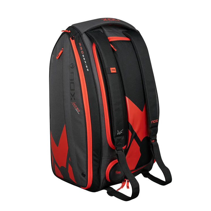 Con el nuevo Bolso AT10 XXL de Nox destacarás en tu camino a la pista gracias a su diseño potente y gran capacidad de almacenaje, que te permitirá llevar todo lo necesario para triunfar en el terreno de juego. Este modelo ha sido específicamente diseñado para el jugador Agustín Tapia en color negro con detalles en rojo.