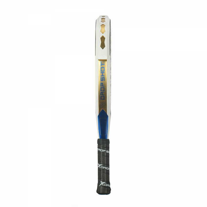 Una pala de pádel Drop Shot Canyon Pro que brilla por su confección, pero también por su estética. Elegante, dinámica y deportiva a partes iguales, esta pala de pádel luce sobre un fondo blanco que contrasta a la perfección con los detalles dorados y azules que monopolizan sus caras y que permiten al Look tornasolado trabajar con la incidencia de la luz para generar diferentes espacios cromáticos.