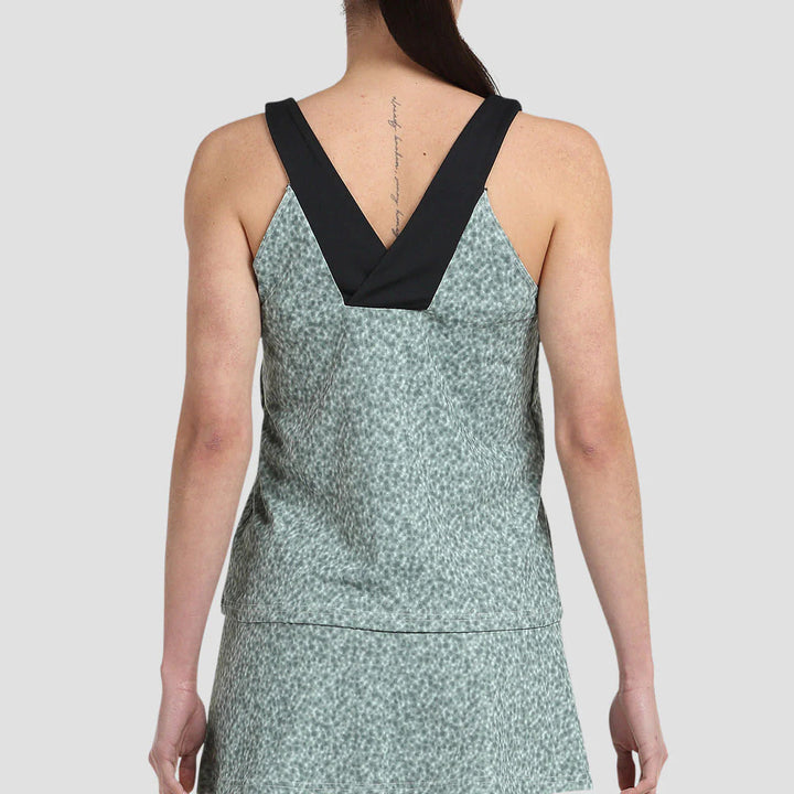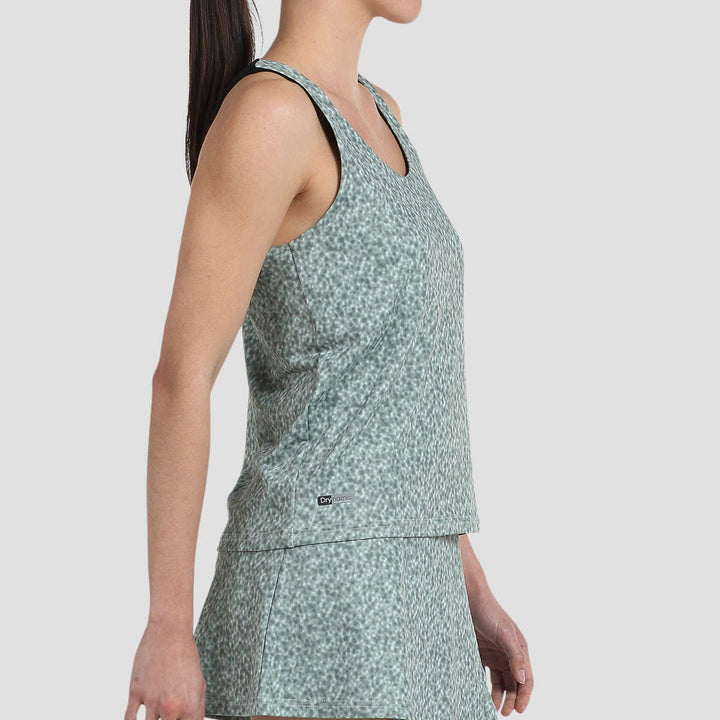 Tank top de jersey elástico sublimado con tirantes y espalda semiperforada., con estampación sutil a tono y silueta más amplia. Fabricado con tejido jersey de poliéster elástico, se le aplica la tecnología Drynamic.