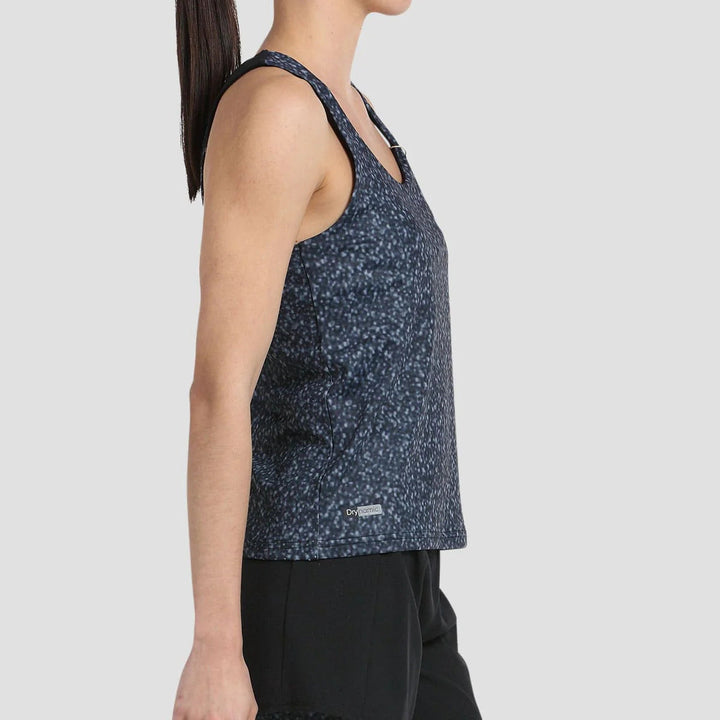 Tank top de jersey elástico sublimado con tirantes y espalda semiperforada., con estampación sutil a tono y silueta más amplia. Fabricado con tejido jersey de poliéster elástico, se le aplica la tecnología Drynamic.