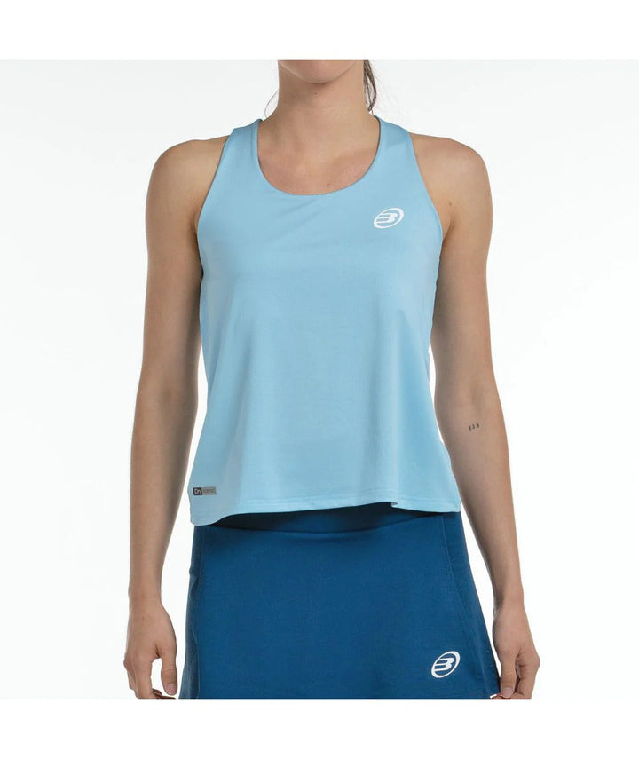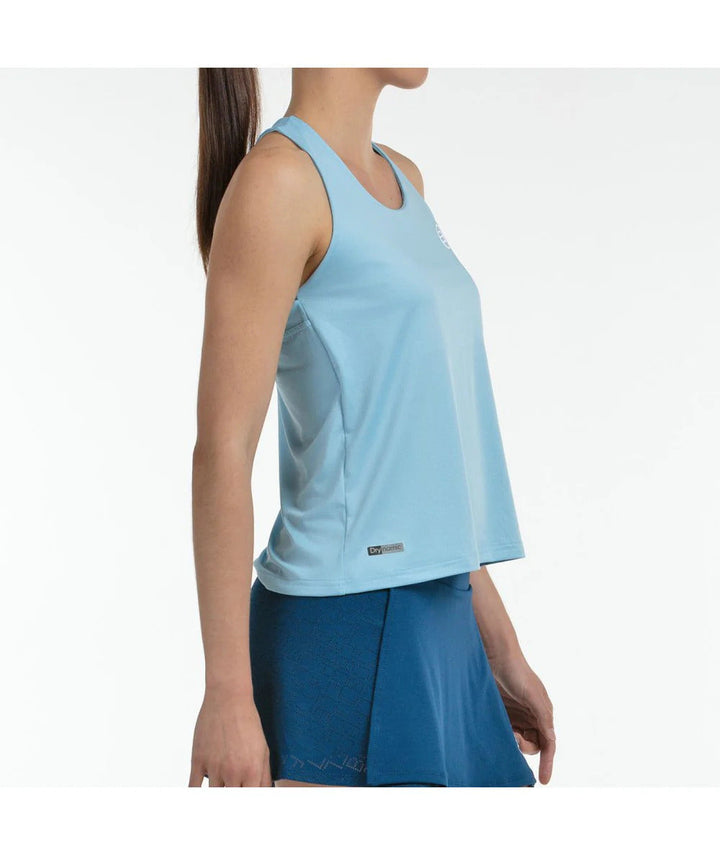 La combinación del acabado Drynamic y el tejido técnico de poliéster y elastano conceden a la jugadora unas magníficas sensaciones en la pista, ya que favorece la transpirabilidad, suavidad y comodidad. Su diseño incorpora tirantes anchos cruzados con inserción de tulle, logo Bullpadel en el pecho y una banda personalizada.